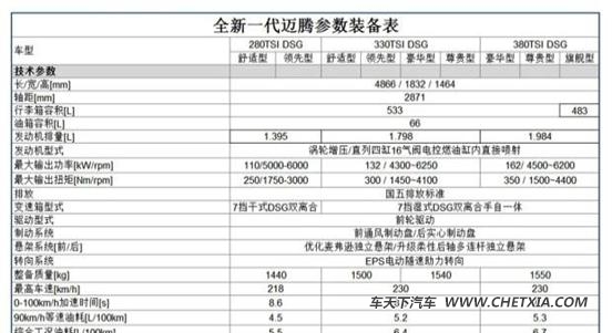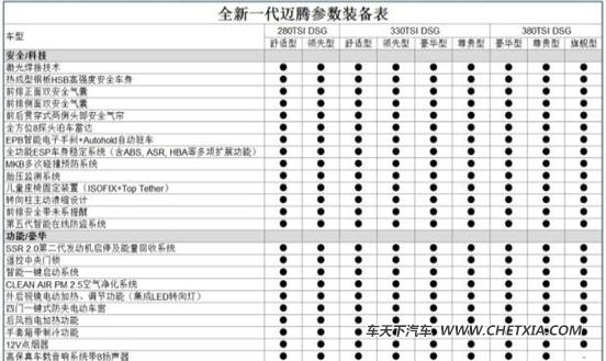 报价 参数 图片 论坛)的部分配置信息,新车将推出3种动力共9款车型,从配置来看,全新一代迈腾全系标配8探头泊车雷达、6安全气囊、全led尾灯、mkb多次碰撞预防系统、esp车身稳定系统、ssr 2.0发动机启停以及能量回收系统等配置。此前官方公布的预售价区间为20.29-32.89万