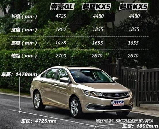 车身尺寸方面,帝豪gl的长宽高分别达到4725/1802/1478mm,轴距为2700mm,其中轴距相比现款帝豪增加50mm。