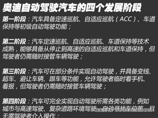 奥迪自动驾驶汽车共分为四个发展阶段,其中第三阶段自动驾驶系统为可实现并线超车、避让车辆、跟车等功能,并允许驾驶者临时看手机,但仍需随时接管车辆驾驶。之所以全新a8配备第三阶段自动驾驶模式,也是由于目前自动驾驶技术相对不够成熟,避免出现更多问题。