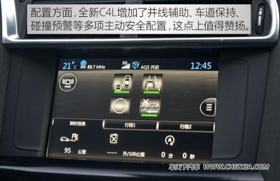 内饰方面,新款c4l的整体造型与现款车型基本一致,主要变化在于采用了全新样式的挡把以及挡把后方的储物格。配置方面,新款c4l将装配大尺寸显示屏、多功能方向盘、电子手刹、自动空调等配置,并配备有车载影像系统、盲点监测、车道保持、预防碰撞系统以及发动机启停等实用功能。