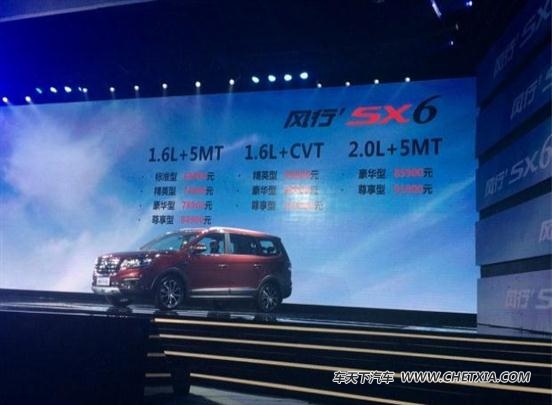 2016年7月24日,东风风行旗下全新中型suv——东风风行sx6正式上市。新车搭载1.6l和2.0l两种排量的自然吸气发动机,共9款不同配置可选,售价区间为6.99-10.29万