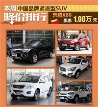奔腾X80降1万 中国品牌紧凑SUV降价排行 车天下汽车网 发表于:2015-07-11 01:30 [车天下行情分析]随着近几年来suv市场的不断火热,越来越多的中国品牌希望在这一领域能够有所建树,在关注度较高的紧凑型suv细分市场,各中国品牌都相继推出了颇有竞争力的车型。 -